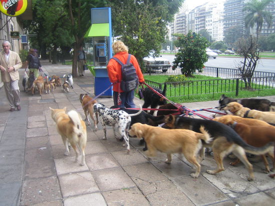 ach ja, hunde gibt es hier auch viele... die streuner halten sich allerdings sehr im hintergrund. man nimmt sie kaum wahr, obwohl es recht viele sind, wenn man einmal darauf achtet. alle hunde -auch die an der leine- verrichten ihr geschaeft wo es ihnen gerade einfaellt. man stelle sich einmal vor, in buenos aires muessten die menschen ebenfalls die haeufchen in kleine tueten packen wie in deutschen staedten! undenkbar hier. man muss beim laufen sehr aufpassen, nicht in ein "kleines dezentes" hauefchen zu treten. die hunde werden alle zusammen von dog-sittern ausgefuehrt, was dann ungefaehr so ausssieht: