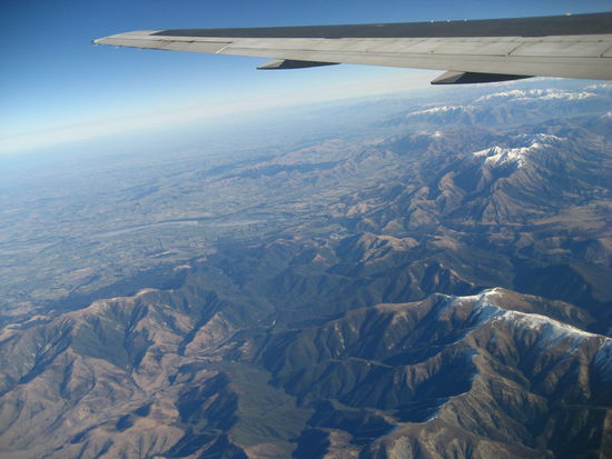 aus dem flugzeug hatten wie einen wunderbaren blick ueber quer neuseeland: das bild zeigt schoen, wie sich nach den weiten ebenen der ostkueste die alpen in die hoehe schrauben hinter denen dann rechts die westkueste ins meer abfaellt. neuseeland hat unglaublich viele gesichter.