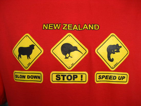 der kiwi (der natinalvogel) ist heilig, wie dieses t-shirt zeigt . kuehe und schaafe sieht man in massen und ueberall. wenn die schaafe lammzeit haben von september bis november duerfen deren wiesen, die oft teil von wanderwegen oder zugaenge zum strand sind, nicht mehr betreten werden. schaaf vor tourist, was sicher auch seine berechtigung hat!