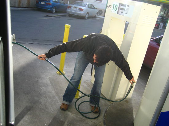 seine gasflasche kann man ebenfalls an jeder tanke auffuellen lassen. einmal tanken heisst somit 3 fliegen mit einer klappe, was dann bei chris in akrobatikhaltung so aussah: (er meinte ich muesse nicht helfen)