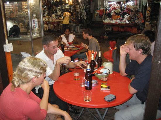 und zum abschluss des tages kamen wir abends bei lecker thai-suppe ins gespraech mit steffen aus muenchen und dem schwulen rafael aus berlin, der seit 2 jahren mit dem fahrrad um die welt faehrt (soviel zu unserer voellig normalen weltreise, wenn man mit anderen reisenden ins gespraech kommt, die noch viel krassere sachen machen...). wir hoffen rafael findet in brunei seinen scheich, der ihn heiratet und ihm sein weiterradeln sponsort. nichts ist unmoeglich