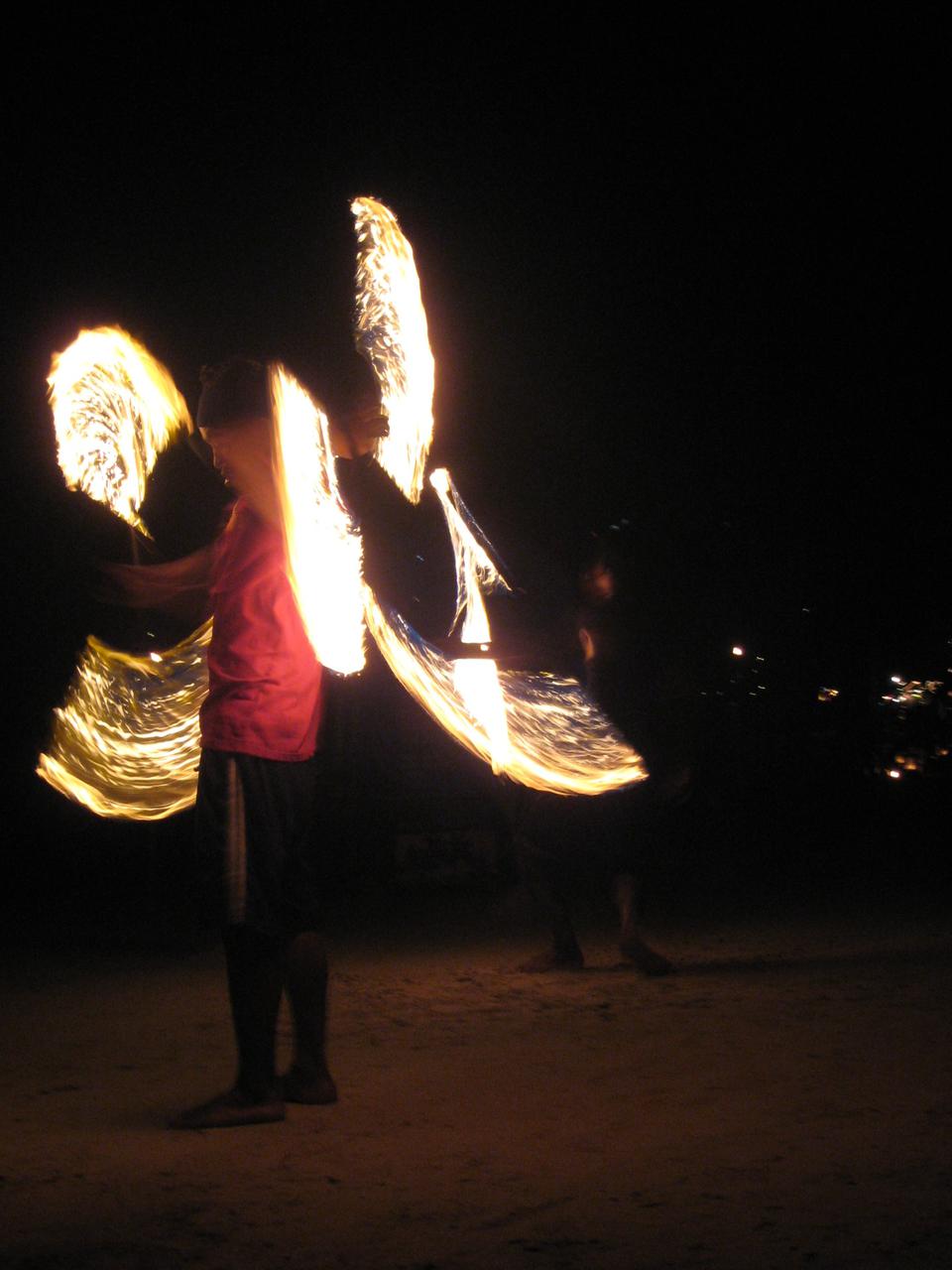 naja, manchmal hatten sie ihre feuerstaebe und ketten nicht so im griff und es flog mal einer mitten ins publikum. mag auch an den kleinen selbstgedrehten "zigaretten" liegen, die die typen fleissig rauchten. doch auf ko tao ist alles easy, alles locker...!