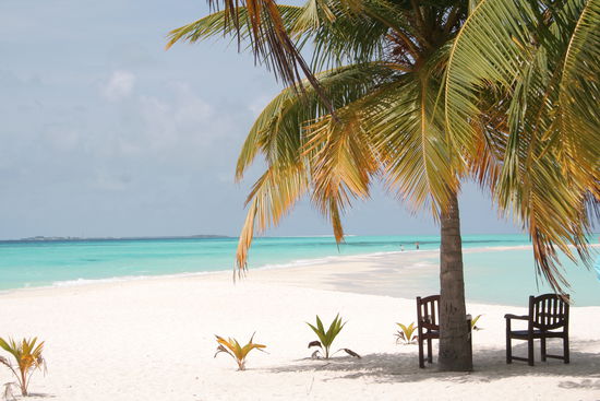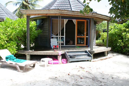 Ein kleines Stückchen mussten wir laufen und dann standen wir schon vor unserer "Beach-Villa". Ich hatte ja einige Fotos schon im Internet gesehen aber das man durch die Terrassentür auch reingeht hat mich überrascht. Aufgeschlossen und rein. WOW!!! So schön hatte ich mir es nicht vorgestellt. Es ist sehr schön eingerichtet, das Zusatzbett für unsere Tochter passte auch rein und man hatte noch genug Platz. Der Ober-Hammer war das halboffene Badezimmer. Ein paar Meter nur und man stand im Meer der Malediven.Wir haben eine Stereoanlage, eine Wasserkocher (etwas Tee, Kaffee, Cappuccino und Zucker), Klimaanlage (läuft immer wenn man will) und einen Ventilator. Handtücher für die Dusche und Handtücher für den Strand, also wir hätten garkeine mitnehmen müssen.
