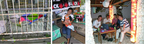 "Nurie", ein gefiederter Hausgenosse im Clownskostüm begrüßt uns morgens mit einem "hallo" oder "kuckuck" (wenn man genau hinhört). Er liebt Bananen und Knabber-Äste und freut sich stets über etwas Zuwendung Mit einem "selamat pagi" werden die Ankömmlinge am Morgen von den Inhabern der Tokos freundlich begrüßt, eine Art Tante-Emma-Läden auf dem Weg in Richtung Strand, in der auch banale Nachrichten, wie unsere Ankunft, bereits längstens bekannt sind.