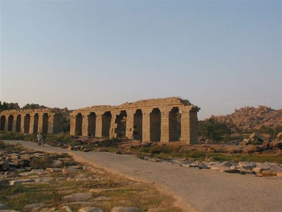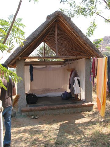 In Hampi angekommen beziehen wir unser Quartier in Rishimuk (karte) bei Peter und Franziska. Die beiden wohnen hier mit ihren beiden huebschen Toechtern und anderen Menschen und haben sich in diesem kleinen Tal einen Traum erfuellt. Es ist ruhig hier. Viele Baeume wurden angepflanzt und Reis und Erdnuesschen. Ein ausgekluegeltes Bewaesserungssystem haelt alles am laufen. Es gibt einen Essraum der offen ist beim Haupthaus und viele verschiedene offene oder geschlossene Unterkuenfte. Ausserdem einen grossen Meditationsplatz wo wir unseren Workshop haben. Dann gibt es einen Pool (unglaublich aber wahr) und Grundwasser, dass man direkt aus dem Hahnen trinken kann (fast noch unglaublicher) und einen kleinen Zoo mit Eseln, Pferdchen, Kamelen, Ochsen, Laufenten, Gaensen und natuerlich einigen Hunden die uns bewachen. Man koenne hier auch mal einer Schlange oder einem Skorpion begegnen und anderem Getier. Ein acht- und behutsames sich fortbewegen ist hier angesagt...