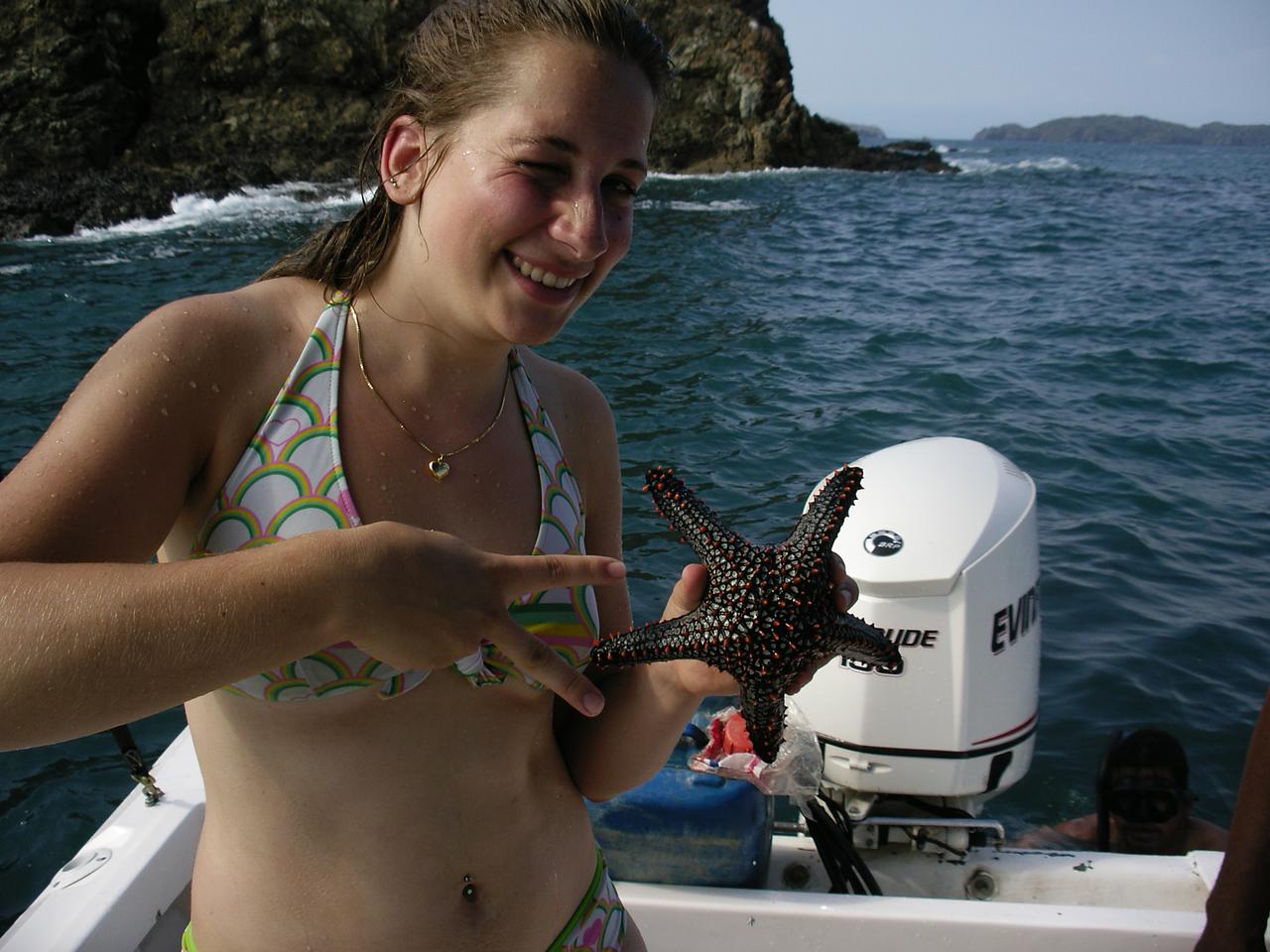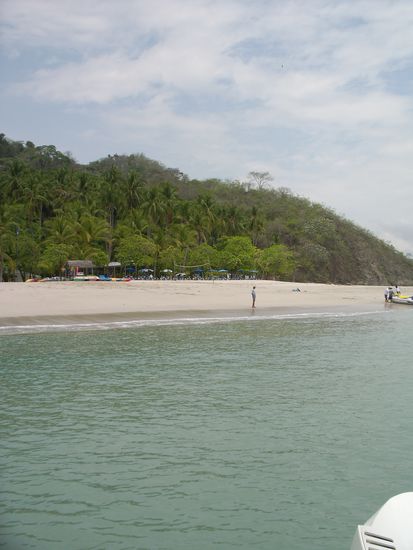 Wir naeherten uns der Isla Tortuga, die eigentlich dem costaricanischen Staat gehoert, aber einer reichen Tico-Familie vermietet und anvertraut wurde. Die Familie wohnt auf dieser tropisch-paradiesischen Insel und unterhaelt sie (nach Meinung der Einheimischen ist sie jedoch dran und drauf die Schoenheit der Insel zu zerstoeren). Ein grosser Teil der Insel, alles tropischer Trockenwald, ist deshalb Privatgrund. Auf der Insel gibt es nur einen oeffentlichen Strand (der einzige Strand auf der Insel , auf dem einige einfache rustikale Huetten zum Picknicken zur Verfuegung stehen. Die Isla Tortuga traegt ihren Namen im Grunde zu Unrecht, denn auf der Insel siedeln keine Schildkroeten. Dafuer entdeckten wir bei einer kleinen Schnorcheltour vor der Insel die vielfaeltige und farbenpraechtige Meereswelt. Fische, Seesterne, Schlangen, Algen, grosse, kleine, dicke, duenne, gepunktete und gestreifte. Alles Moegliche war im klaren, tuerkisfarbenen Wasser zu beobachten.