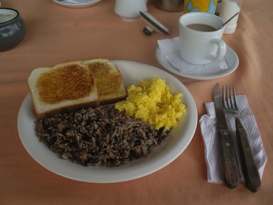 Mischt man nun die Grundzutaten der costaricanischen Kueche Reis, Frijoles und Wuerze zusammen, ist man schon in der Lage, das Nationalgericht "Gallo Pinto" hinzuzaubern. Der Name "Gallo Pinto" bedeutet wortwoertlich uebersetzt bemalter Hahn.