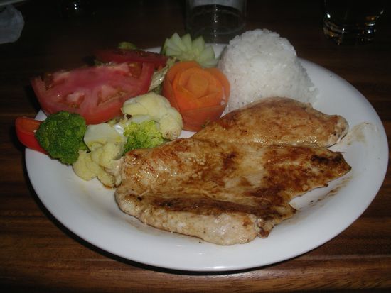 Die Hauptbestandteile einer Mahlzeit ist in Costa Rica Trockenreis. Schwarzen Bohnen, Frijoles genannt, fehlen auch selten. Ein typisches Gericht nennt sich Casado, was soviel heisst wie "Verheiratetes". Ein Casado besteht grundsaetzlich aus Fleisch, Fisch oder Eiern mit Reis und schwarzen Bohnen als Beilage. Je nach Restaurat bzw. Koch/Koechin wird das Casado meist mit einer Auswahl aus Weisskohlsalat, Gemuese, Pastasalat, Randen (rote Beete ) und Eiern an Mayosauce, gekochtem Kuerbis und frittierten Bananen serviert. Das ganze kann mit Chilisauce, Curtido (scharfe Mischung aus Peperoncino und Gemuese) und/oder Salsa Lizano (Tico-Version einer Worcestershire-Sauce) gewuerzt werden. Diese drei Saucen stehen hier (aehnlich wie bei uns Salz und Pfeffer) sozusagen auf jedem Esstisch und mindestens einer dieser Saucen verleiht dem Tico-Gericht das gewisse Etwas. Pure Wuerze auf dem Teller ist jedoch eher weniger mein Ding. Aber Geschmaecker sind ja bekanntlich verschieden...