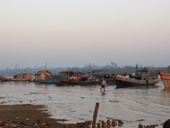 Es gibt einiges zu sehen: das kleine White Sand Island, die Insel Hpokkala Kyun die auch Aung Mingalar genannt wird und nur duch die Muendung eines Flusses von Festland getrennt ist. Mit einem der Fischerboote fahre ich fuer 1 US Dollar dahin und umrunde die Insel in 2h. Eine Frau mit einem Baby auf dem Arm hilft mir, Mut zu fassen, durch Schlick, Felsen und Wasser zu laufen. Ich sammle schoene Muscheln, besuche die Pagode auf dem Felsen. Die Frau freute sich so ueber ein bisschen Trinkgeld, dass sie, sobald ich an ihrer Huette vorbeikam, mir Tee anbot.