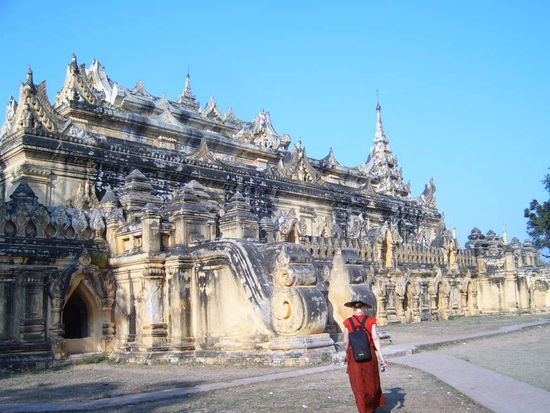 Nun... diesen Moench - Ottama, traf ich in Yangoon in der beruehmten Shwedagon Pagode, die ich noch zeigen werde. Er ist Moench seit er 4 Jahre alt ist und kommt von der Kueste. Er zeigte mir viele schoene Dinge und wir verstaendigten uns mit Haenden und Fuessen, da sein Englisch nur durch TV-Schauen erlernt war. Da ich bereits fuer die Fahrt zum Strand 2 Tickets hatte, sagte ich ihm, dass er mitkommen koenne, weil Tina noch krank ist. Eigentlich dachte ich nicht, dass er mich richtig versteht. Ich war um so mehr ueberrascht als er am naechsten Morgen um 4 Uhr am Busbahnhof stand. Er kann im Kloster schlafen. Ich bin ganz aufgeregt. Alles ist so anders hier und dann noch mit einem Moench in Begleitung. Alle geht gut.