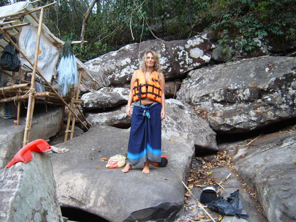 Wir machen an Felsen Rast, wo Fischer ihre Netze trocknen. Hier gibts kurz was zu Essen bis es weitergeht. Es ist anstrengend und uns tun jetzt schon die Arme weh. Der Fluss ist bis auf einen Wasserfall zumeist traege und man hat viel zu paddeln. 4 h insgesamt. Puhh. Gut fuer die Mukkies.