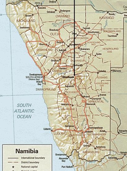 Am Schalter der Air Namibia steht schon eine gewaltige Schlange. Wir stellen uns an den Gruppenschalter, da wir ja eine Gruppe von 3 Personen sind. (Wir - d.h. diesmal sind wir mit unserer Freundin Christel unterwegs, mit der wir schon manche Länder bereist haben) Dies scheint sich auch zu lohnen, denn es geht erheblich schneller, aber die reservierten Plätze der Reihe 14 sind bereits vergeben! Wie bei Cathay Pacific will man uns Plätze weit auseinander geben, doch nach Reklamation bekommen wir dann drei Plätze nebeneinander in der letzten Reihe vor dem Raucherabteil. Christel's erster Ausspruch: "Ich weiß nicht, ob das nicht mein letzter Langstrecken-Economy-Class-Flug ist." Mit meinen kürzeren Beinen ist das insgesamt noch erträglich. Da wir wegen des langen Anstehens auch nichts zu essen bekommen haben, müssen wir doch auf das Abendessen im Flugzeug warten, etwa gegen 23.30 Uhr ungefähr eine Stunde nach dem Start. (pochierter Lachs - recht schmackhaft) Dann werfen wir die Schlaftabletten ein. Bei Christel wirkt sie bis ca 4.00 Uhr, bei Ulrike und mir bis zum Frühstück um 6.00 Uhr.