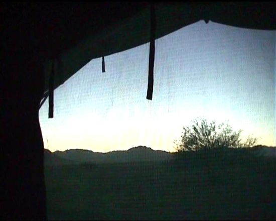 Die Morgendämmerung dringt durch das Zeltnetzfenster.