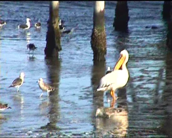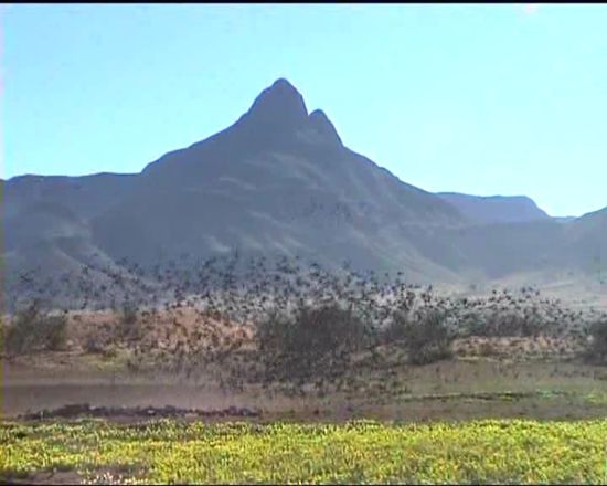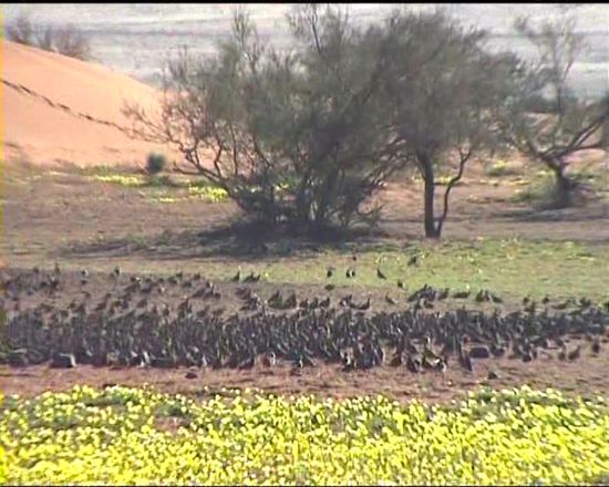 Riesige Vogelschwärme landen zum Trinken an dem kleinen Wasserloch vor unserer Zeltreihe; es ist Stimmung wie bei Hitchcocks Vögel.