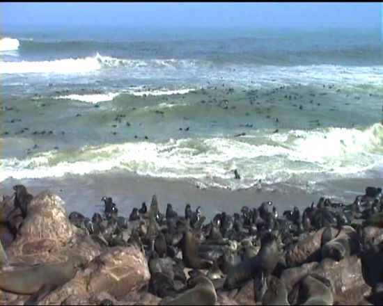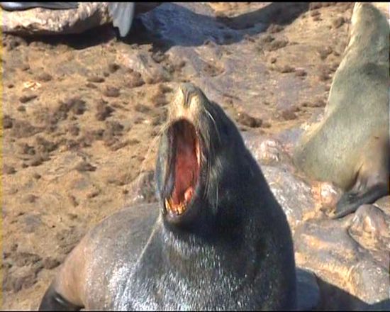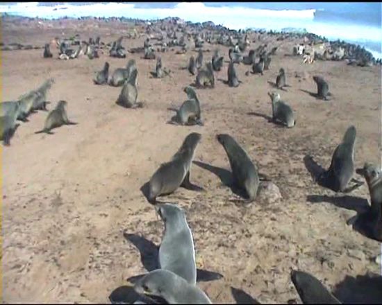 Nach weiteren 3 km ist der Parkplatz, kaum ausgestiegen, kommt uns ein unsäglicher Gestank entgegen, den wir aber sofort wegstecken, als wir an die 'Schutz'mauer herantreten, denn Tausende von Robben tummeln sich auf kleinen und großen Steinen, meckern z.T. wie Ziegen oder Schafe.