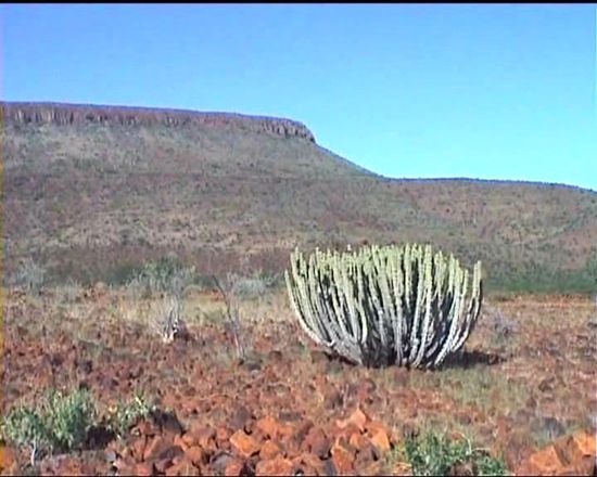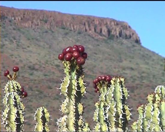 Spitze Berge, Tafelberge, rote Erde, grüne Täler und eine ganze Reihe neuer Flora (Knubbelmelonen, blühende Kakteen, Bäume mit roten Blättern, die eigentlich Samen sind.).