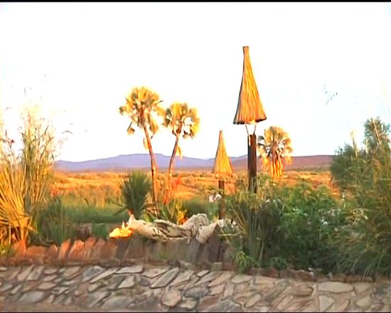 Zunächst gibt es Zwiebelsuppe, dann fängt es an zu regnen und -haste was kannste - tragen wir alles nach innen. Kaum haben wir alles wieder arrangiert, hört der Regen wieder auf. Kudu-Gulasch, Squash - alles sehr lecker. Für Ulrike gibt es sogar Creme Caramel zum Nachtisch. Ein holländisches Paar berichtet von ihrem Dienst in der Entwicklungshilfe; sie leben jetzt in Malawi (Jahresdurchschnittseinkommen 120$). Herr Zahn, der Lodge-Manager, erzählt von den kleinen, schlanken Damara-Frauen und zeigt auf seine beiden dicken schwarzen Hilfskräfte. "Wenn sie Urlaub gehabt haben, sind sie viel schlanker. Dann arbeiten sie wieder in der Küche."