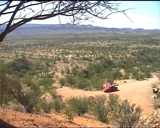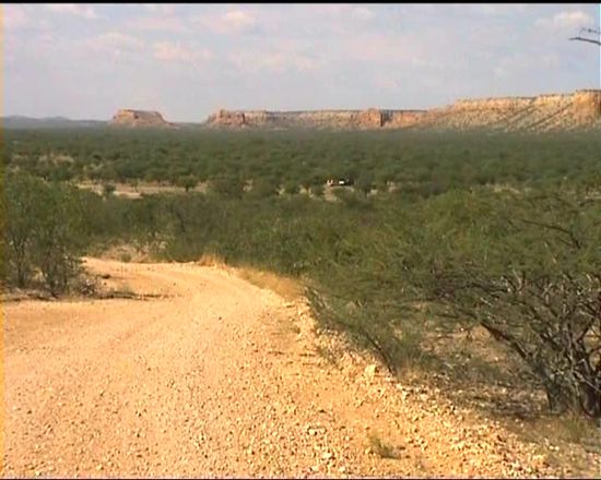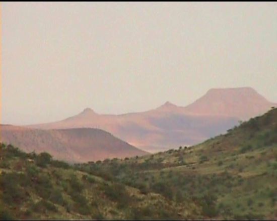 Da ich mehr Schlafensvorsprung habe, stehe ich wieder um 6.00 Uhr zum Sonnenaufgang auf. Beim Öffnen der Türe liegt unser Wachhund direkt vor meinen Füßen und wedelt mit seinem Schwanz den Staub hoch. Nachdem der Generator eingeschaltet ist, kann ich auch meinen obligatorischen Morgenkaffee kochen. Dabei scheine ich noch nicht ganz uptodate zu sein, denn in meinen Becher gebe ich fünf Löffel und die Thermoskanne ist mit einem Löffel versehen und daher natürlich mit 'Bodenseh'-Kaffee gefüllt. Gegen 7.00 Uhr tut sich was, Ulrike betritt die Terrasse und ich soll Christel wecken. 8.00 Uhr Frühstück. Gegen 9.00 Uhr fahren wir los und wählen die Route über den Grotberg-Paß (1540 m ) nach Kamamjab, nachdem wir das Tierseuchengatter, das uns schon seit der Skelett-Küste begleitet, passiert haben.