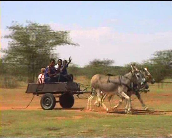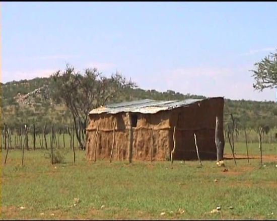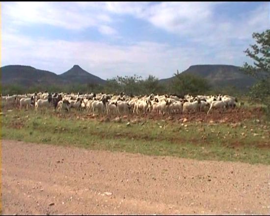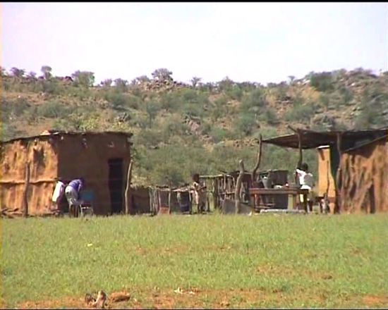 Man merkt, daß der Norden stärker besiedelt ist, denn mehrere Ziegenherde kreuzen den Weg, wir kommen an kleinen Dörfern vorbei, an Lehmhütten mit Wellblechdach und eigenartigen Umzäunungen aus langen Holzstangen.