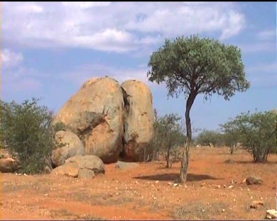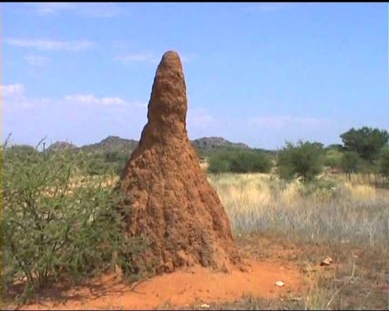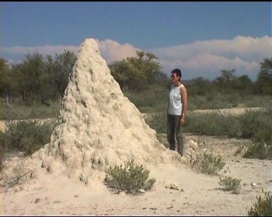 Plötzlich sind wir auf einer Teerstraße (C39) und ich stelle fest, daß man wieder etwas durch den Rückspiegel sieht. Ulrike dreht sich um und kann nichts erkennen. Kurz vor unserem Quartier tauchen die ersten Thermitenhügel auf, in allen Farben, so wie auch die Naturpisten permanent die Farbe gewechselt haben.