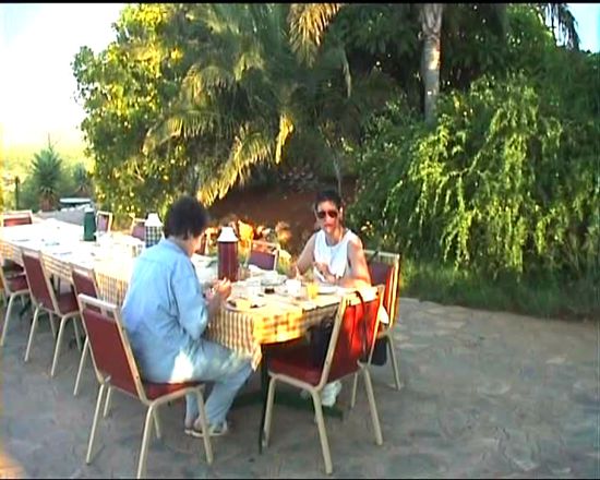 Danach nimmt Christel wieder eine Auszeit. Ulrike und ich machen schnell schnell und genießen auf der überdachten Terrasse bei leichtem Regen noch einen Drink, wo inzwischen bayerische Neuankömmlinge Platz genommen haben. Später setzt sich auch Herr Zahn dazu und erzählt. Er erwartet heute noch 6 Gäste, darunter auch das Ehepaar Goebel. Doch zur Abendessenszeit (Kudu-Frikadelle, Squash, Creme Caramel) sind alle 6 noch nicht eingetroffen. Goebels erscheinen so gegen 20.30 Uhr und haben Horrorgeschichten zu erzählen von Unwettern, Überschwemmungen bei Uis Min, der geplanten Route nach Khorixas und von dreistündigem Warten auf das Ablaufen des Wassers auf der Straße Uis Min - Omaruru. Sie mußten mehr als 200 km Umweg fahren.