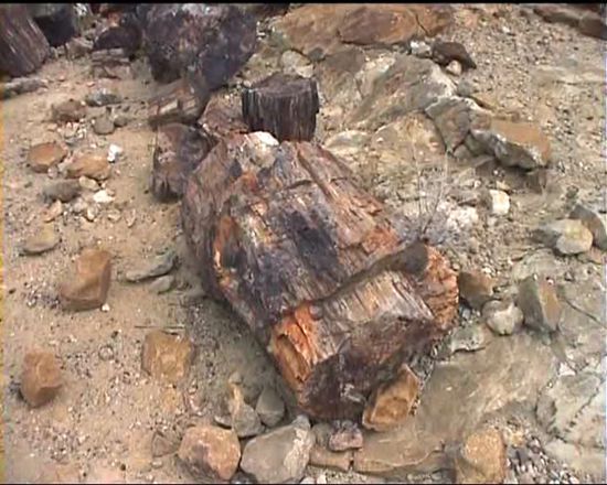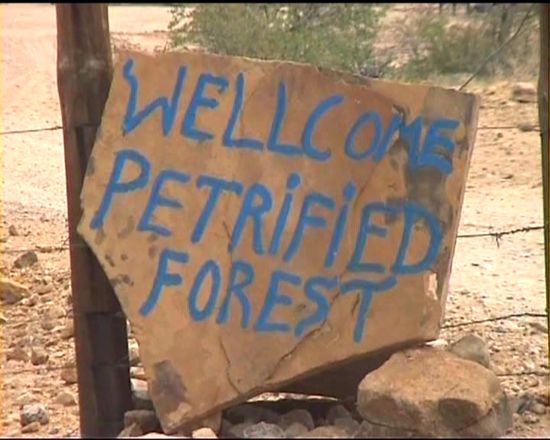 Auf der Rückfahrt zur Hauptstraße filme ich Christel bei der Berg- und Talfahrt. Wenig später ist dann auch der Himmel rabenschwarz, so daß wir Angst haben, den versteinerten Wald nicht mehr besuchen zu können.