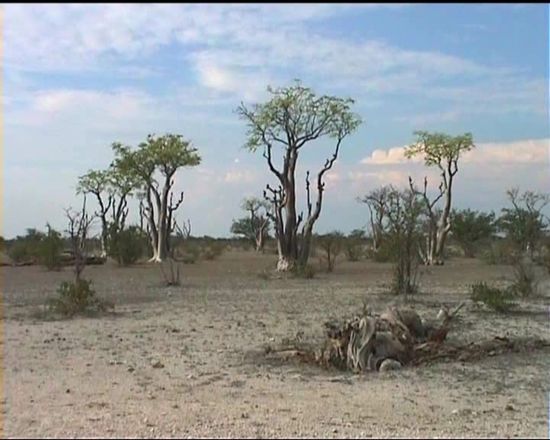 Märchenwald (Flaschenbäume), eine Herde Zebras und Giraffen in weiter Ferne sind die heutige Ausbeute westlich von Okaukeio.