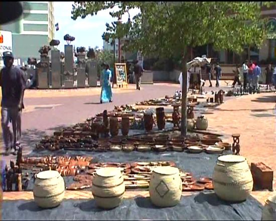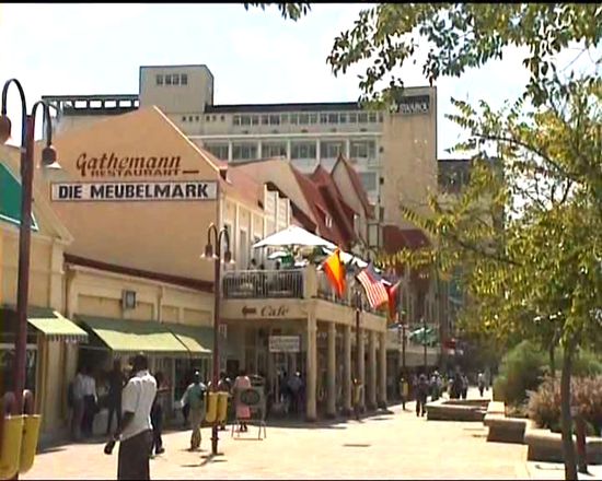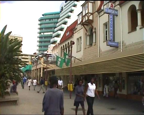 Nun wollen die Damen shopping im Namibian Craft Centre. T-Shirt, Hemden, Straußeneier. Bei Budget parken wir danach unser Drecksauto, die Angestellten wollen ihn sofort putzen. Über die Post Street Mall schlendern wir zur Independance Avenue. Ulrike kauft am laufenden Band Salatbestecke und 'Sitztiere'! Ich suche dagegen eine 2m-Giraffe, finde aber in ganz Windhoek keine!