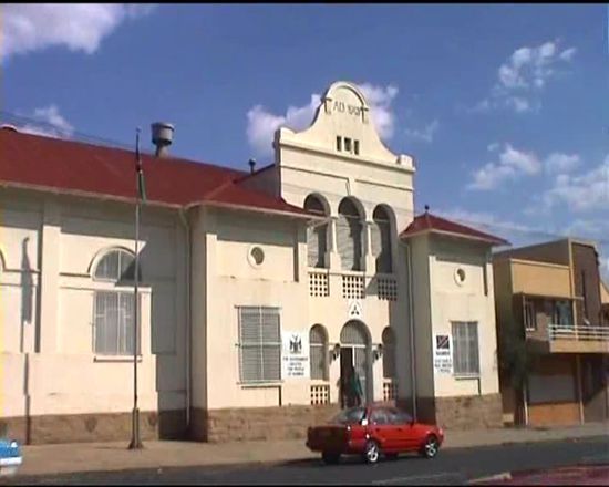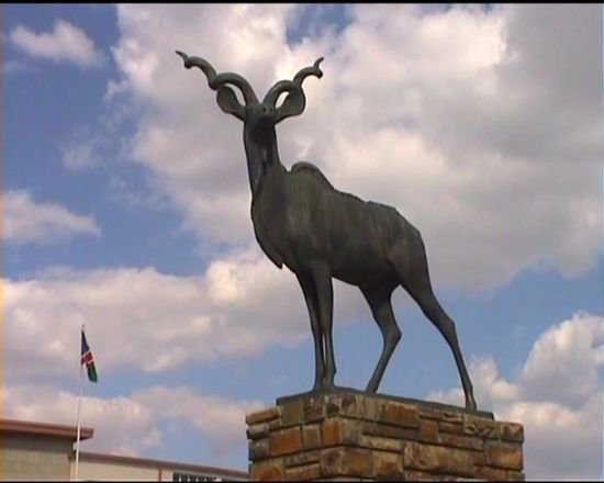 Im Gatheman-Restaurant nehmen wir einen leckeren Snack (Wildschinkenplatte, geräucherten Schwertfisch). Danach müssen wir uns noch das Kudu-Denkmal und die Turnhalle ansehen.