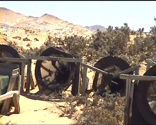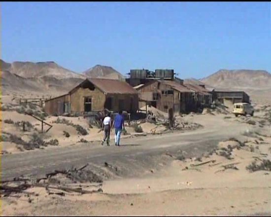 Dann erreichen wir den ersten Ort alter Diamantenschürfer - die Häuser sind zum Teil vom Sand zugeschüttet, altes Werkzeug und alte Maschinen verrotten vor sich hin.