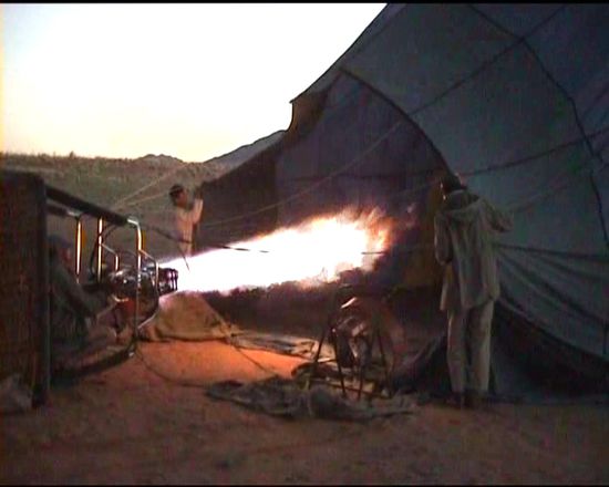 Alle erscheinen pünktlich um 6.15 Uhr zu einer Tasse Kaffee und einer Scheibe selbstgebackenem pain d'épices. Dann geht es ca. 200 m in die Wildnis, wo einer der Hilfskräfte eine Handvoll Sand hochwirft, um die Boden-Wind-Richtung zu testen. Der Ballon ist erstaunlich schnell startbereit und wir gehen zunächst auf ca. 600 m Höhe, um den Sonnenaufgang zu erleben und westwärts über die Dünen zu schauen.