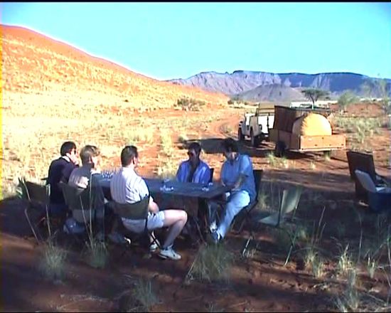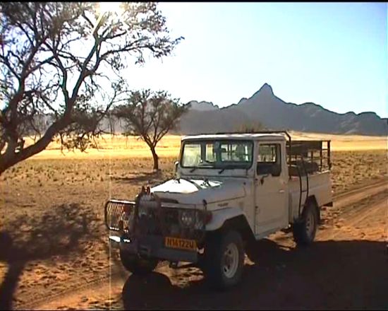 Er kommt aus Zaire (von belgischen Eltern) und machte vorher Safari-Fahrer-Guide, wo er auch Nathalie kennengelernt hat. Gegen 9.30 Uhr erreichen wir wieder das Camp. Nathalie hat sich für uns nach einem Transport am Sossusvlei erkundigt.