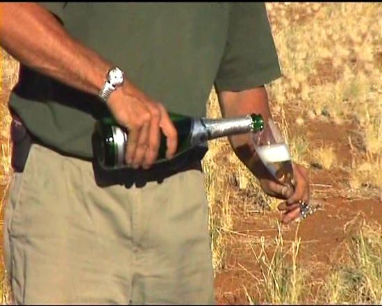 Nach der Landung gibt es im Busch das sog. Champagner-Frühstück. Die schwarzen Jungens, mit denen Ulrike - wie schon gehabt - im Begleitwagen dem Ballon gefolgt ist, bauen im Handumdrehen ein umfangreiches Büffet auf. Philipp öffnet den Champagner und erzählt von seinen Taten.