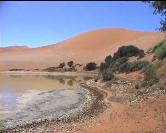 Dort bekommen wir die Shuttle-Tickets und das Eintrittspermit und können die 63 km durch das breite Tal , das von Sanddünen gesäumt ist, zum Vlei fahren.