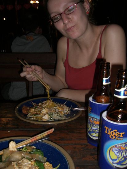 Im kleinen Restaurant nebenan (Tony's Place) scheint der Urlaub fuer uns beide erst so richtig anzufangen! Der Stress von Bangkok faellt von uns ab!