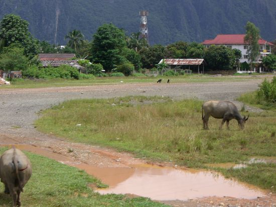 Nach einer wunderschoenen Fahrt durch die Berge und Taeler sind wir super in Vang Vieng angekommen und haben ein tolles Zimmer bezogen. Endlich ist es mal wieder etwas kuehler und die Unternehmungslust steigt ins unendliche.