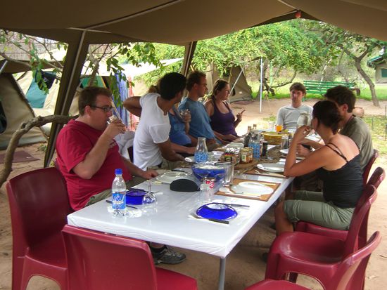 Pro Tag finden drei Ausfahrten statt, weshalb auch bereits um 05.00 Uhr Tagwache ist. Gleich nach dem Aufstehen beginnt die erste Safara. Dann gibt es zMorge und gleich danach geht es bis um 14.00 weiter bis zum Mittagessen. Von 15.00 bis 18.00 sind wir dann das dritte mal am Tag unterwegs. Am Abend sitzen wir mit unseren Reisebekanntschaften aus der ganzen Welt am Lagerfeuer, erzaehlen Geschichten und hoeren den Tieren ausser UND innerhalb des Camps zu. Echt eine super Erfahrung!