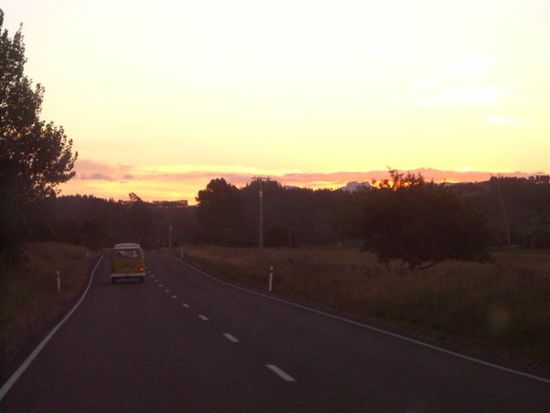 ...dem Sonnenuntergang entgegen, vor uns Donna in ihrem VW Kombi
