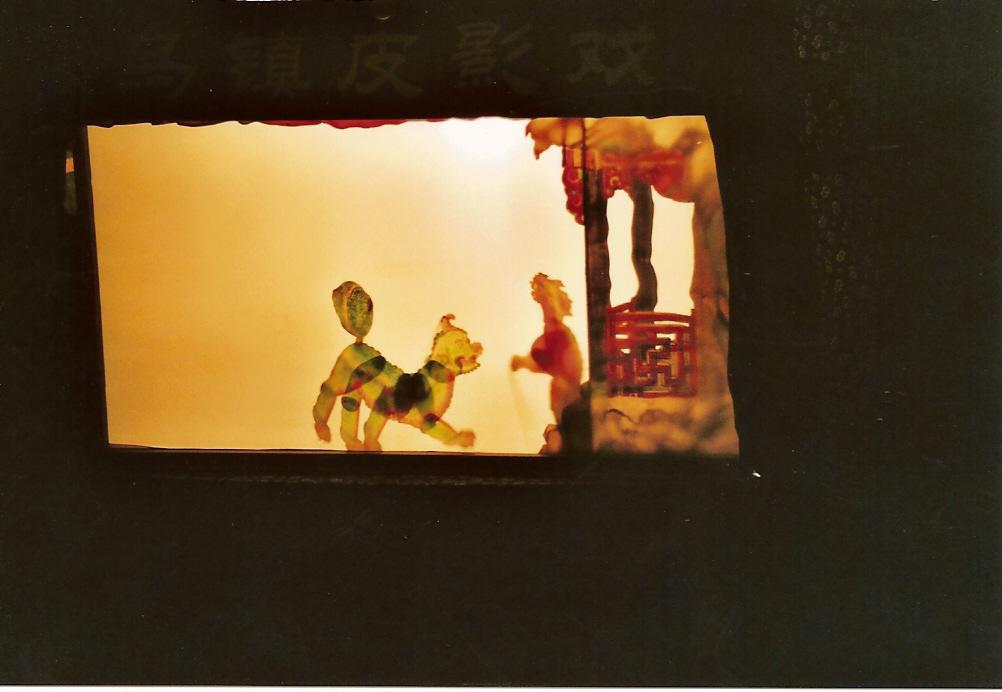 Aber wir mussten zu einer bestimmten Uhrzeit zum Hauptplatz zurück, denn dann sollte es mit dem Schattenspieltheater weitergehen. Die erste Vorstellung, die wir sahen, war so voll, dass wir hinten stehen mussten und ich nur einige Fotos machte. Aber ich war begeistert: die filigranen und gelenkigen Figuren werden an Stäbchen direkt an der Leinwand gespielt und deshalb erscheinen sie scharf und man sieht sogar die farbige Bemalung. Vom Inhalt verstand ich nichts und nach 10 Minuten war alles vorbei. Aber ich wollte noch mal und so blieben wir während der Pause da und später saß ich zwischen chinesischen Omis in der ersten Reihe und sah noch mal das gleiche Stück - mit Fabelwesen, Himmelhunden oder ähnlichen "Akteuren". Einen Blick hinter die Kulissen konnten wir auch werfen, allerdings aßen die Stäbchenbediener nur Bananen in ihrer Pause - beim spielen habe ich sie leider nicht beobachten können.
