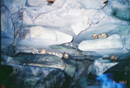 Man sieht ueberall Schaedel und Knochen herum liegen. Ein Toraja Mann versichert uns, dass es kein Problem ist sich die Knochen genauer anzuschauen, also nimmt Markus mal einen in die Hand. Was ist das nun...ein Oberschenkelknochen??