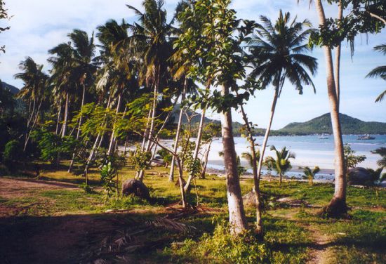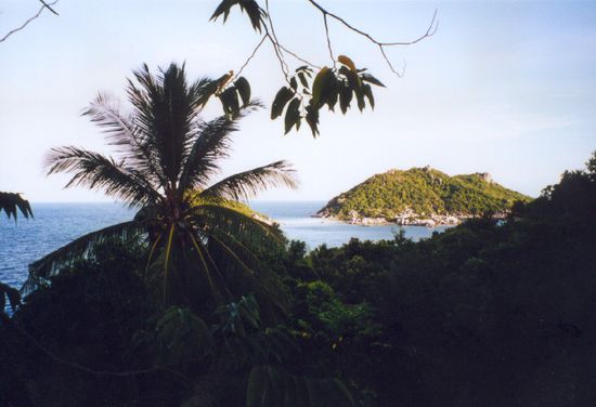 Ich blieb also mit Eva wach um ihr "seelischen Beistand" zu geben. Etwa 1Std. später ging die Sonne auf hinter der Insel Koh Tao die wir bis dahin nur schemenhaft am Horizont erkennen konnten. Wer so etwas schon mal gesehen hat kann mir sicherlich nachempfinden wie schön es ist. Endlich erreichen wir den Hafen von Koh Tao, na ja was bedeutet Hafen, wohl eher Steg... Ist aber egal denn diese Insel wird für den ganzen Trip meine Trauminsel bleiben! So etwas hab ich noch nicht gesehen und ich hab in den letzten Jahren viel gesehen. Die Menschen aus Hollywood hätten "The Beach" wohl eher hier drehen sollen! Wir machen uns also auf zu den QVT- Bungalows. Die sind aber für uns zu einfach deshalb geht es wieder runter an den Strand. Dort nehmen wir uns ein Bungalow direkt am Strand. Name der Anlage hab ich vergessen, macht ja nichts. So, ab ins Wasser!!! Baden macht müde und deshalb schlaf ich erstmal ne runde. Hätte ich lieber nicht getan denn trotz Lichtschutzfaktor 15 hab ich nun den ärgsten Sonnenbrand seit Jahren! Was soll´s... Hab ja noch fast einen Monat um die Haut wieder zu bräunen. Jetzt wäre ein Bier recht (hi hi). Gott, ich hab Hunger! Also -> ESSEN! Die Preise in Thailand sind ja eh der Hammer. Für rund 5DM, bekommt man ein Frühstücksmenü, mit dem man(n), nicht fertig wird. Nur vom Kaffee sollte man die Finger lassen. Schmeckt teilweise nach gekochten Schuhen. Eva wollte in Deutschland abgemacht, täglich längere Strecken schwimmen um in Form zu bleiben. Leider wurde daraus nichts da sie so Angst vor Haien hatte. Ich versuchte sie zwar zu beruhigen doch es nützte nichts. Sie blieb bei ihrer Angst und schwamm nicht zu weit hinaus. Aber ihre Hai Begegnung sollte sie noch bekommen . Davon aber später mehr. Nach 2 weiteren Badetagen machten wir uns auf nach KOH PHA NGAN.
