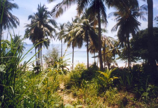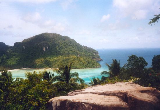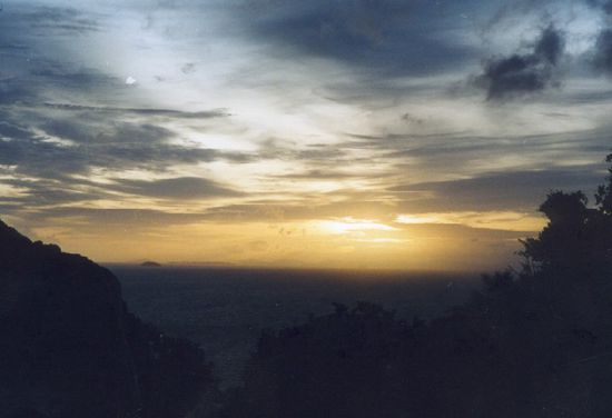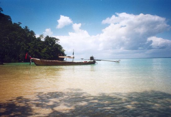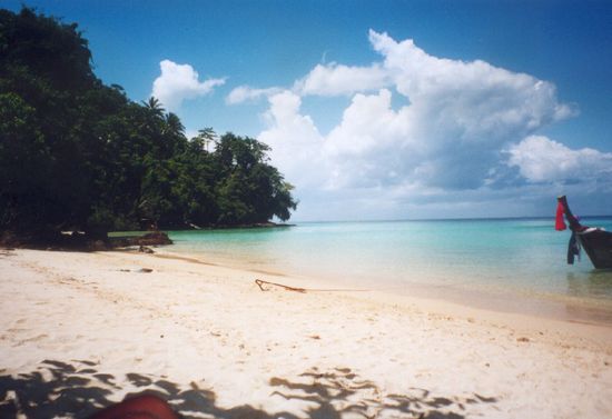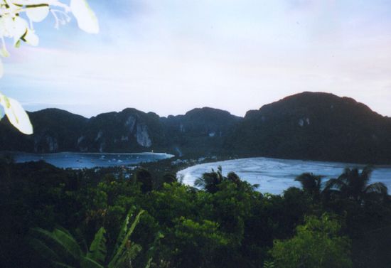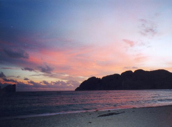 Endlich geht es nach Phi phi. Hatte mich schon den ganzen Urlaub darauf gefreut dort anzukommen. Während der Überfahrt kam meine "neu erworbene" Seekrankheit mal wieder sehr stark zum Vorschein. Hab mich dann entschlossen zu schlafen, weil ja nämlich die Zeit dann schneller vergeht. Wieder aufgewacht sah ich sie, die Insel meiner Träume Koh Phi phi. Wenn man an ein Leben nach dem Tod glaubt und an das Paradies dann ist es sicher auf dieser Insel. Selbst im Hafenbecken der Insel in dem ja die ganzen Fähren anlegen sieht man keine Art von Verschmutzung. Ja man kann sogar bis auf den Grund des 5m tiefen Wassers sehen in dem alle Arten von Fischen ihr Zuhause zu haben scheinen. Jetzt müssen wir erst mal wieder mit einem Taxiboot zum Viking Beach fahren da es ja auf der Insel keine Strassen oder Autos gibt. Der Viking Beach ist traumhaft aber die Bungalows (50 Baht), sind nicht das wahre. Also gehen wir weiter zu Fuß durch den Dschungel zum Longbeach. Hier bleiben wir für ne Woche bis unsere Begleitung endlich heim fliegt. Hier kann man auch ganz toll Schnorcheln und tauchen. Der "Shark-point" Koh Phi phi´s liegt ca. 30m entfernt vom Strand. Endlich hab ich Eva davon überzeugt mit mir dort Schnorcheln zu gehen (wobei ich nichts von den Riff-Haien gesagt hab). Kam aber eh keiner. Jetzt war Eva hin und weg vom Schnorcheln doch das richtige Flaschentauchen konnte ich ihr nicht schmackhaft machen. Besonders dann nicht als ich ihr sagte, dass wir am Shark-point Schnorchelten und sie mit mir fast kein Wort mehr sprach! Am darauf folgenden Tag, machten wir uns zum View Point auf um die herrliche Aussicht auf die 2 Halbmond Strände zu genießen. Echt super schön! Hinter dem View Point geht ein Trampelpfad durch den Dschungel der zur Rantee bay führt. Wieder mal ein Wahnsinns Traumstrand an dem wir den ganzen Tag verbrachten. Abends war dann mal wieder bis zur Dämmerung shopping angesagt. Was sich aber als Fehler herausstellte da man ohne Taschenlampe nachts nicht durch den Dschungel kommt um den Longbeach zu erreichen. So mussten wir also über viele Felsen und Buchten in tiefster Dunkelheit wandern. So, noch ein paar Badetage und unsere "Begleitung" verließ uns. Wie schade, hi hi. Nun stand es für uns zur Wahl nach Koh Lanta zu fahren oder nochmals ne Woche hier zu bleiben. Nach vielem hin und her blieben wir doch auf Phi phi. Aber ein anderer Bungalow musste her welcher nach 2Std. für 250Baht die Nacht auch gefunden war. Natürlich besuchen wir auch Phi Phi Lay die Schwesterinsel, auf der der Film "The Beach" gedreht wurde. Die Insel kann man mit worten nicht beschreiben. Wir sind dann gleich mal dort Schnorcheln gegangen. Muss man ja in so einer Traumbucht. Und da passierte es auch schon. Eva lief wie Jesus über das Wasser. Was war geschehen??? Ich eilte zu ihr und als ich meinen Blick nach ihrer Hand richtete sah ich ihn... Ein fast ausgewachsener Riff- Hai kreuzte in der Bucht und war sehr nahe an Eva rangekommen. Das bedeutete für mich dass ich sie in dieser Bucht wohl nicht mehr ins Wasser bekommen würde Nach ein paar weiteren besuchen von Buchten und Stränden machten wir uns auf den Heimweg, leider. Am nächsten Tag sollte es nämlich schon wieder Richtung Bangkok gehen, schnief.