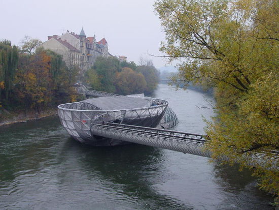 2006 Graz - Insel in der Mur; Wie zwei Schalen einer geöffneten Muschel in Glas und Stahl geschaffen, schwimmt sie mitten in der Mur. Mit Design-Café, Spielplatz und kleinem Amphitheater ist sie beliebter Treffpunkt.