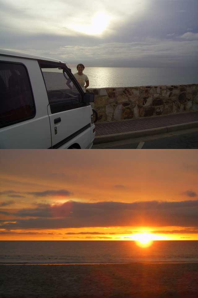 Am 19.3. abends, natuerlich genau zur Rushhour schwebten wir in Adelaide ein. Nach einem kurzen Stop in der Touristeniformation und ein paar kleinen Einkaeufen steuerten wir Glenelg an. Ein relaxter, richtig schoener Kuestenort im Sued-Westen von Adelaide. Glenelg hat ein paar suesse Kolonialgebaeude und einen unendlich weiten Sandstrand. Beim Abendspaziergang konnten wir vorueberschwimmende Delfis beobachten und einen tollen Sonnenuntergang.