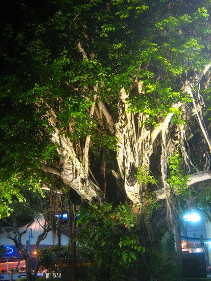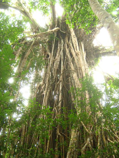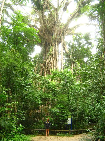 The Cathedral Fig Tree (Ficus virens) im Danbulla State Forest ist ca 500 Jahre alt und einfach unbeschreiblich. Wuerde man um den Baum einen Guertel legen haette er eine Laenge von 44m und die Krone umfasst 2000 qm, ungefaehr die Flaeche zweier Schwimmbecken nach olympischem Mass.Die Hoehe betraegt schaetzungsweise 48 Meter, es soll wohl sehr schwierig sein den Riesen genau zu messen. Die Masse der Blaetter entspricht der eines Kleinwagen und das alles entstand vor hunderten von Jahren aus einem Keim, von der groesse eines Sesam Kernes