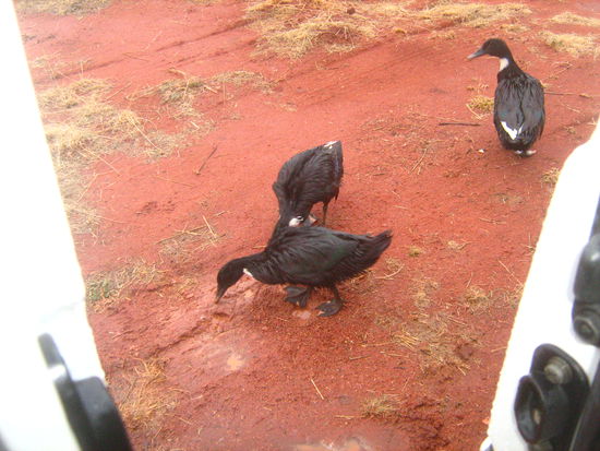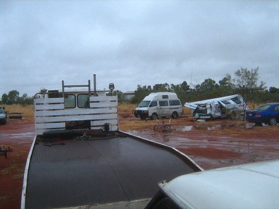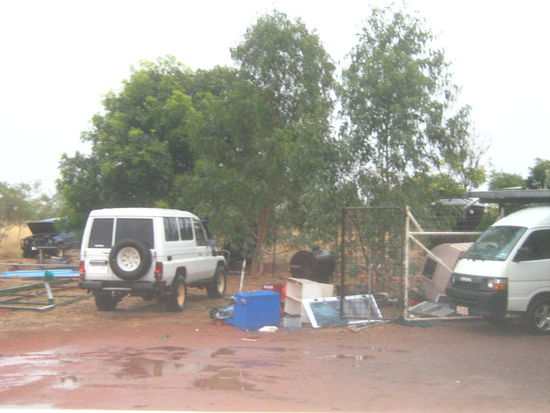 Der Typ namens Brian schleppte uns zu sich nach Hause auf seinen Hof, einige Kilometer hinter Tennant Creek. Dort begruesste uns seine halbnackte super dicke Frau im schlampigen Haus und schwatzte uns eine Versicherung a la ADAC auf, im Northern heisst es AANT. Ohne die Versicherung haetten wir 400 AUD nur fuer das Abschleppen cash bezahlen muesse. Mit der Versicherung mussten wir 200 AUD cash an den Typen und seine Frau zahlen und 210 AUD fuer die Versicherung. Das soll einer verstehen. Wir zahlten was blieb uns auch uebrig und soetwas wie Kassenzettel oder Quittungen gibt es hier nicht, auf die Frage danach gabs nur ein muedes Laecheln. Die Nacht verbrachten wir auf dem Hof im Mitsu...Dauerregen! - da wo es sonst nie regnet. Brian wollte uns gleich morgens um 7-7:30 Uhr zurueck nach Tennant Creek schleppen zur Werkstatt.