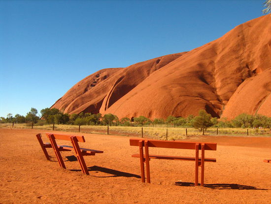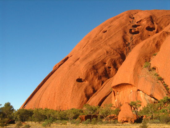 Wer Uluru am Nachmittag besucht, hat einen ocker-braun farbenen Felsen mit unterschiedlichen Schattenflecken vor sich. Die Konturen des geologischen Wunders kann man sich ausgiebig aus der Naehe betrachten, bei einem 10 Kilometer langen Walk um Uluru. Auf Schildern entlang des Walks bekommt man Erklaerungen zu Pflanzen, Tieren, Geologie und Mythologie. Es ist nicht erlaubt Uluru aus jedem beliebigen Blickwinkel zu fotografieren, da einige Seiten heilig sind. Um Uluru ranken sich Legenden der australischen Ureinwohner, die Begebenheiten der Traumzeit erzaehlen und so verschiedene Unregelmaessigkeiten im Aussehen der Felsen zu erklaeren versuchen (darin liegt auch die besondere Heiligkeit bestimmter Plaetze begründet).