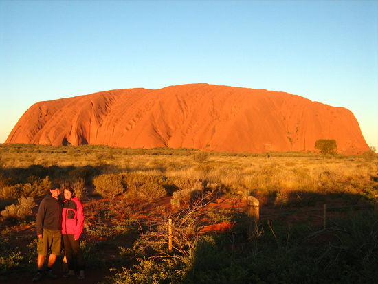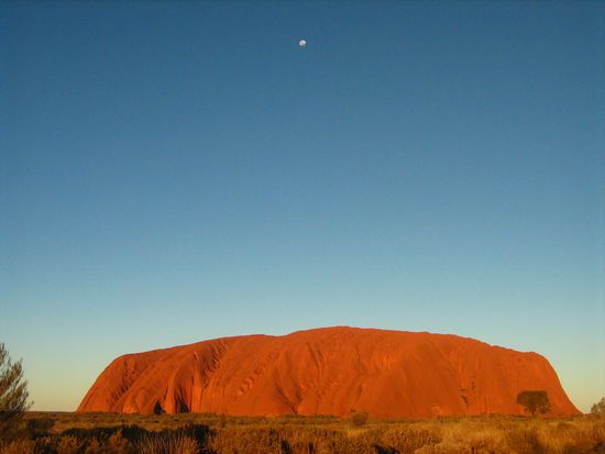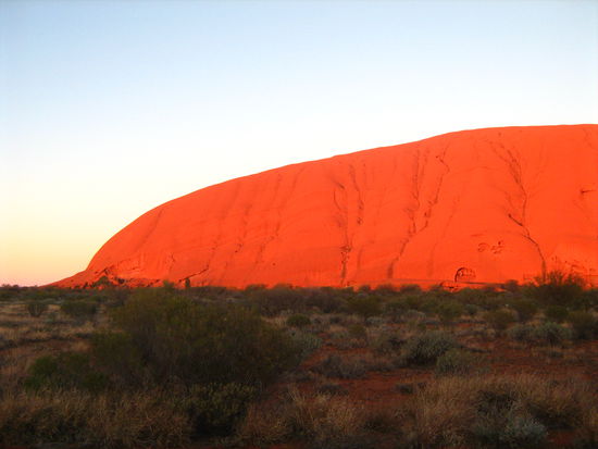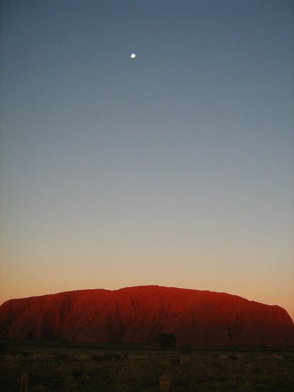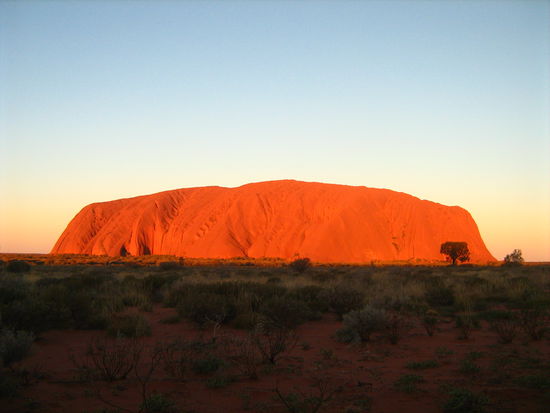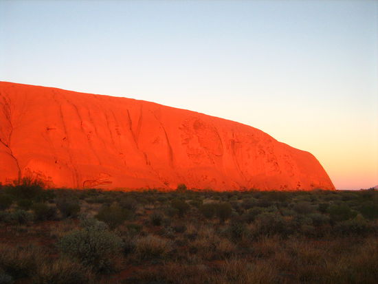 Bei Sonnenuntergang leuchtet Uluru in glaenzendem Orange und verwandelt sich dann zauberhaft in intensive Rottoene, bis die Farbe verblasst und die Nacht Einzug haelt.