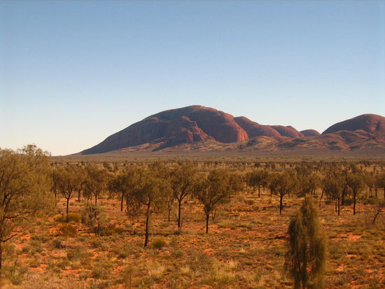 bezeichnet eine Gruppe von 36 Felsen, die wahrscheinlich mehr als 500 Millionen Jahre alt sind. Die 36 Kuppeln der Olgas ragen 32 km westlich vom Uluru aus der wuestenhaften Ebene heraus. Die hoechste Kuppel ist der Mount Olga (benannt nach einer deutschen Monarchin) mit 546 m. Urspruenglich bildeten die Olgas wohl ein einziges gewaltiges Felsmassiv. Aufgrund des groeber strukturierten Gesteinsmaterials konnten die zerstoerenden Kraefte der Verwitterung den Komplex in einzelne Kuppeln aufspalten.