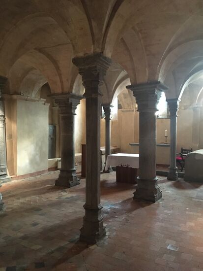 Beeindruckend ist die gewölbte Krypta. Sie ist auf einem rechteckigen Grundriss gebaut, der dem des Chores entspricht. Sie enthält den Sarkophag von Sankt Ursmer und zahlreiche Grabplatten früherer Äbte.